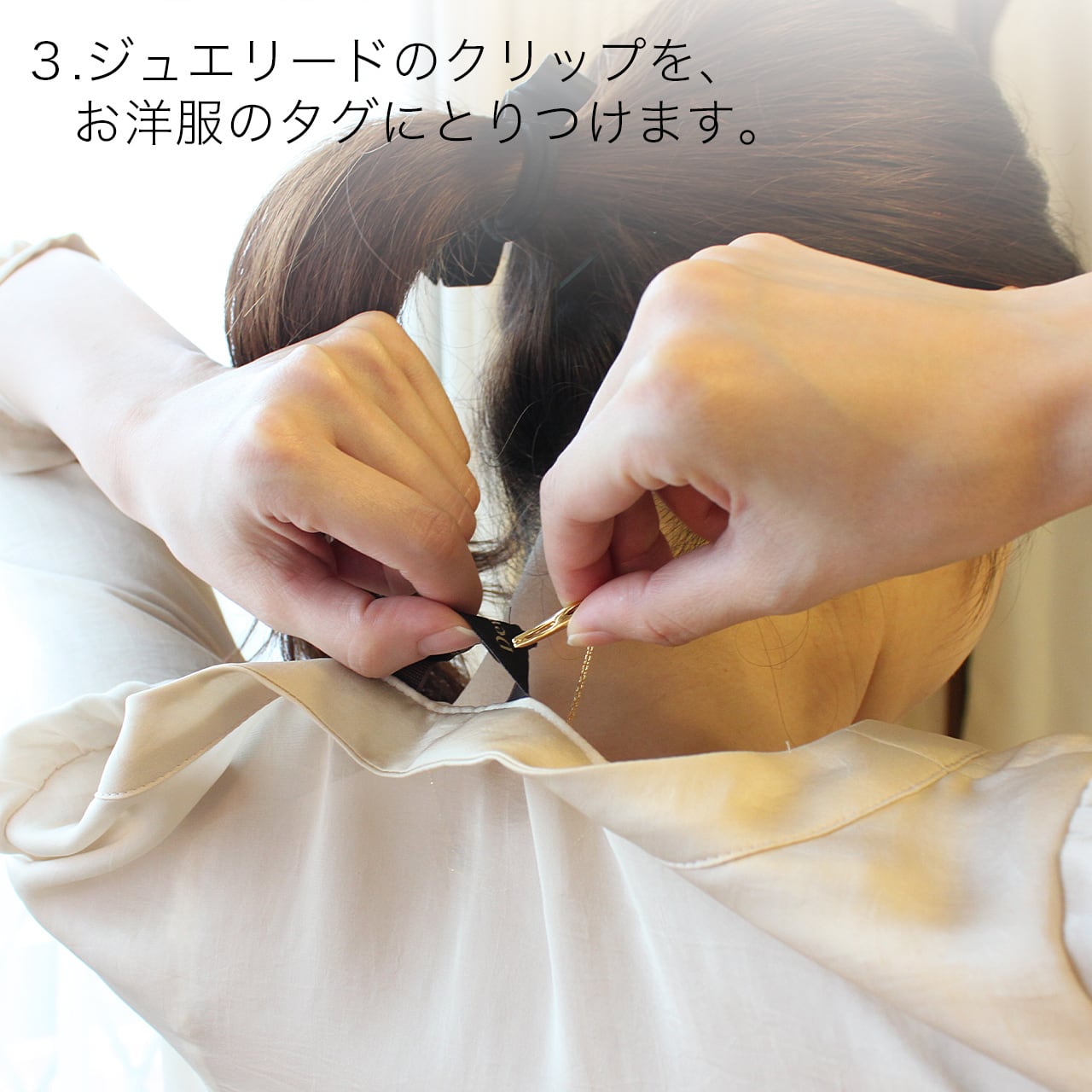 3. ジュエリードのクリップを、インナーや洋服のタグに挟んで固定する